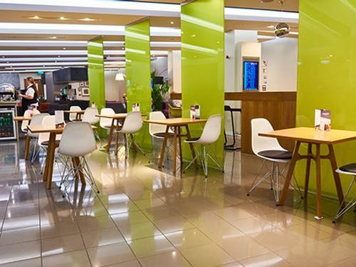 מחוץ לטרמינל – המשיכו בבדיקות הביטחוניות ובאזור החינוך החופשי ממס. עקבו אחר השלטים 'טרקליני פרימיום' לאורך המסדרון מעבר ל'דיקסונס' ועלו במעלית או במדרגות לקומה של טרקלין המנהלים, שם נמצא הטרקלין.