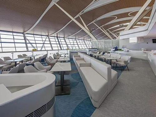 מחוץ למבנה - טיסות בינלאומיות יוצאות. הטרקלין נמצא בסמוך לשער 69 בקומה העליונה. שלטים מורים על הכניסה לטרקלין.
