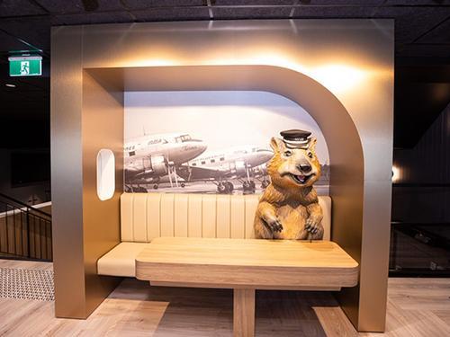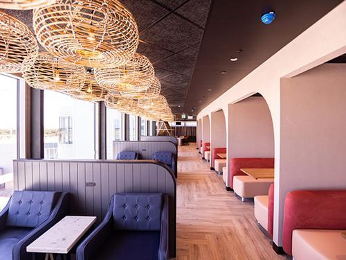 בחלק האווירי - עלו במדרגות לקומה 2 לנסיעות יוצאות, שם ממוקם הטרקלין. לטיסות בינלאומיות ולעוברי דרך בלבד.