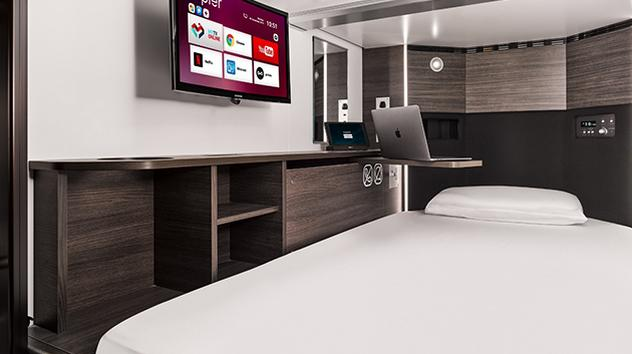 מקסימום שהייה של 3 שעות - ילדים מתחת לגיל 7 אינם מורשים להיכנס - שימוש חינמי ביחידות מנוחה פרטיות ואטומות ללחץ אוויר שלילי, מקלחות וקפסות אחסון. כל יחידת מנוחה מעוצבת ליצירת אווירה של שלווה ומצוידת במיטה ארגונומית בגודל 220 ס"מ אורך x 140 ס"מ רוחב x 110 ס"מ גובה (עד אדם אחד ליחידה), טלוויזיית סמארט עם Netflix ו-YouTube, שולחן עבודה מסתובב, תחנת טעינה אוניברסלית, טאבלט אישי עם מידע על טיסות וקניות ורמקול הפולט צלילים מרגיעים של גל ים – חדר עישון נפרד זמין.